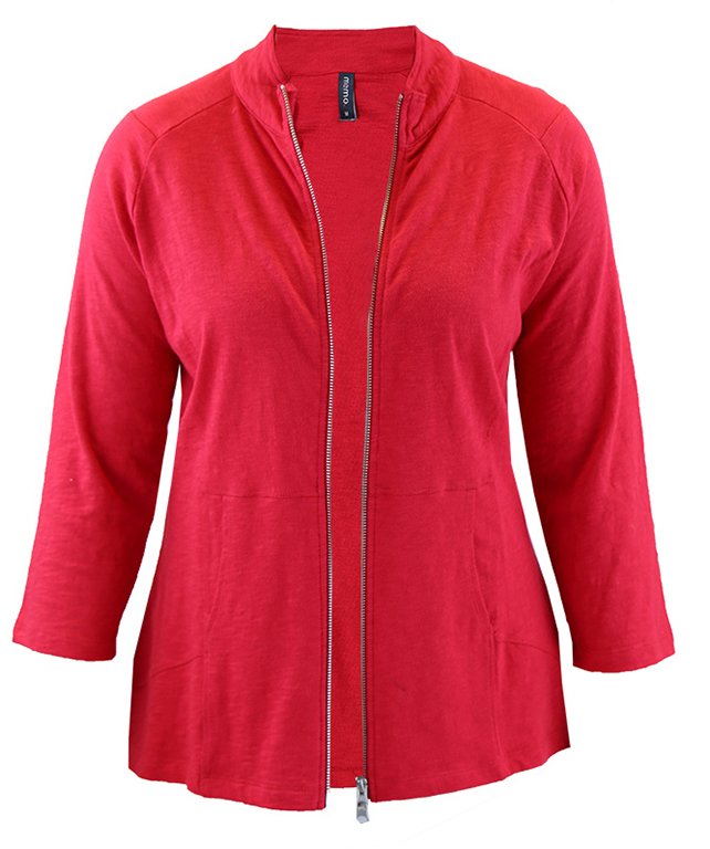 Slub cotton multi-panel zip front jacket with lace trim on the cuffs and hem. A bonus with kangaroo pouch pockets makes it a weekend favorite.