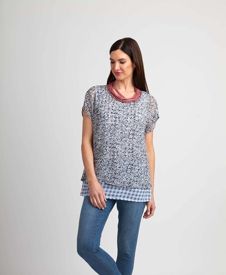 Layered woven tee Overlayer is short sleeve with a split back & a double button closure at the centre back Underlayer is a woven tank Body length from the shoulder to the hem of the underlayer is approx. 71cm & to the hem of the outerlayer is approx. 60cm (size 12)