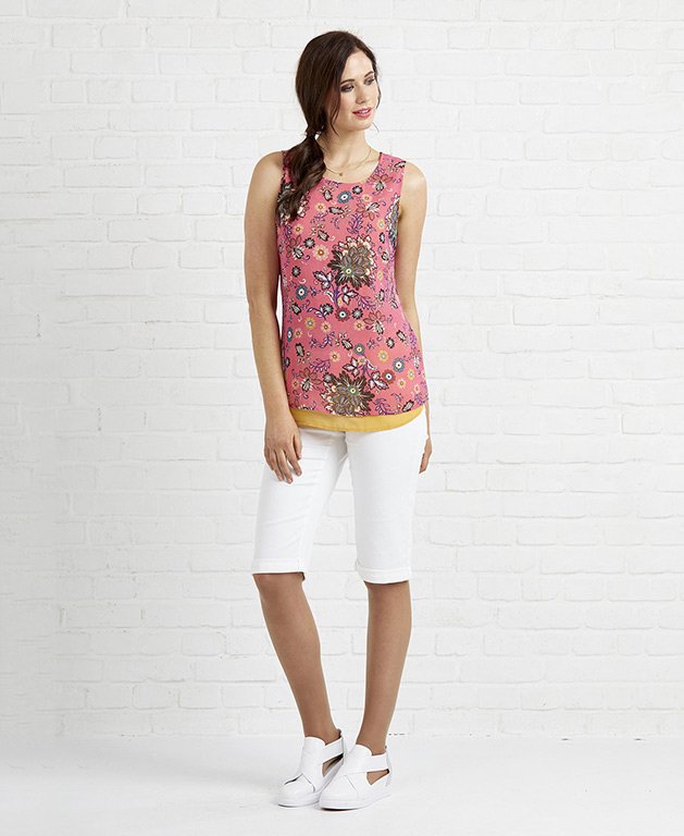 Layered look sleeveless chiffon top Floaty printed overlay top with a plain contrast colour layer underneath (popping out at the hem & under the crossover back detail) All in one top so easy to get on with no fuss