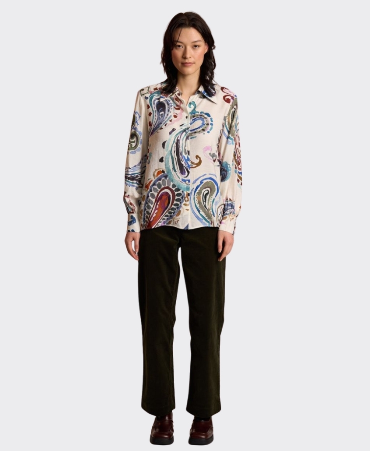The Gia Shirt by Neris is a sweet and playful wardrobe piece, designed to bring colour and personality to everyday dressing. Featuring a bespoke paisley print that has been hand-painted, this shirt is crafted on a crisp base and finished with a classic pointed collar and self-covered buttons for a polished touch.