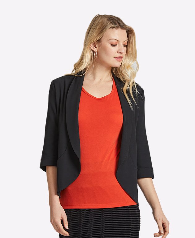 A jacket to take anywhere. This stretch polyester jacket comes with a turn up cuff 3/4 sleeve, and a shawl collar which wraps around to a panel across the bac offering great style.