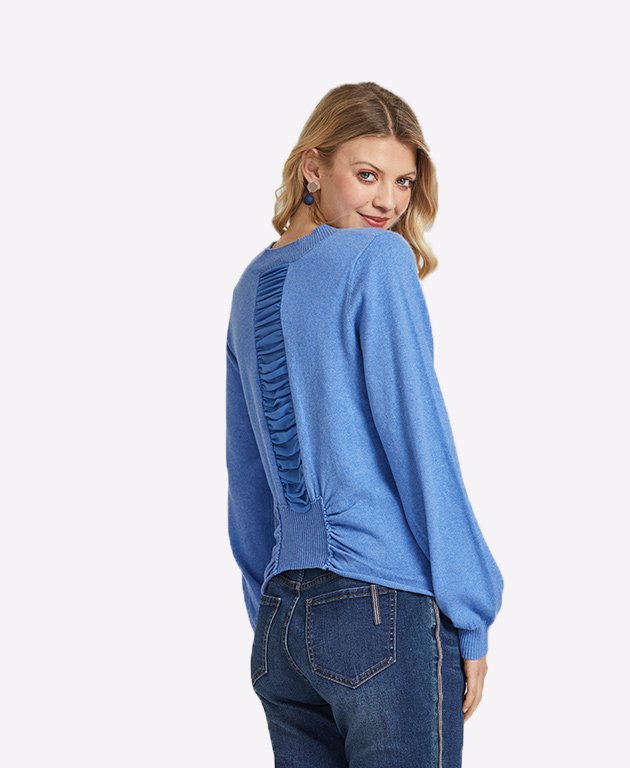 A super feminine cotton/cashmere mix knit with centre back rouched sheer panel.