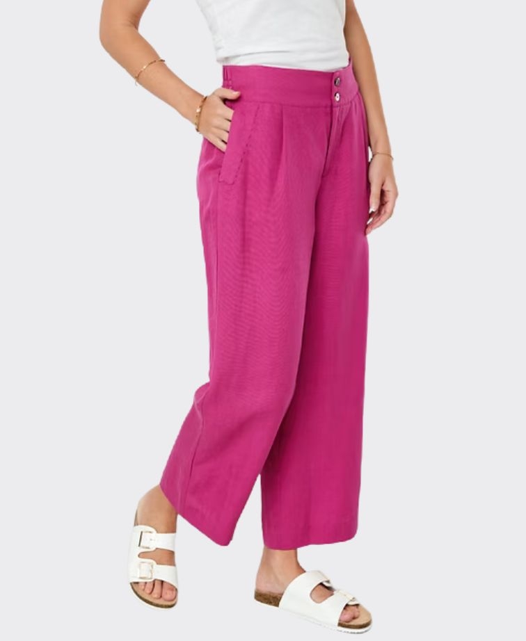 Wide double button fly front with elasticated back waistband. 7/8th length. Front pockets with scalloped lace trim edge. Mock back pockets.