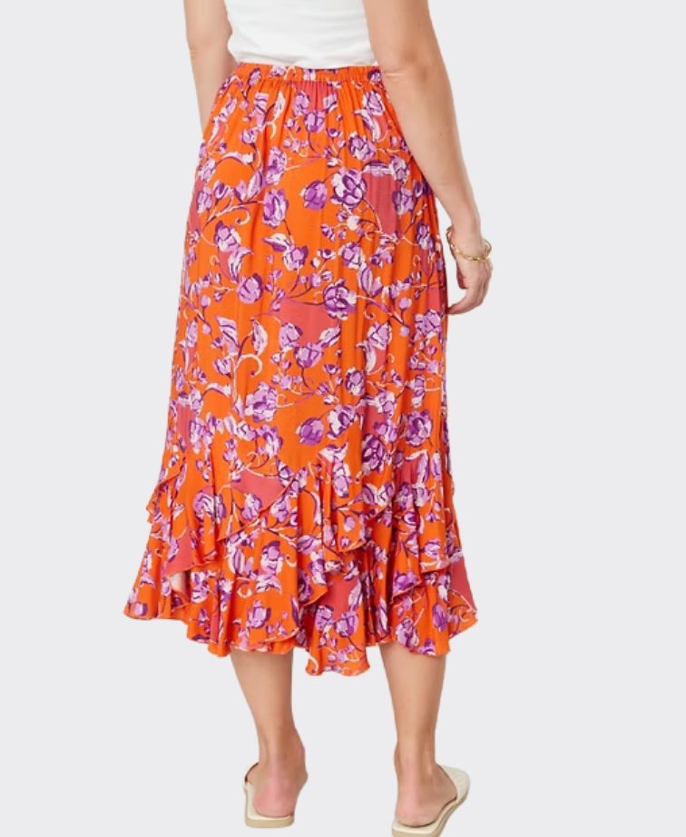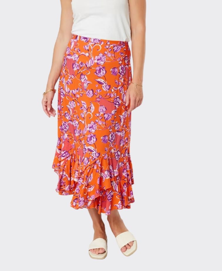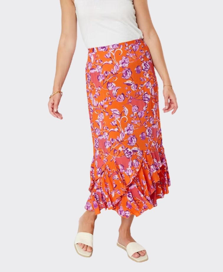 Flat front, elasticated back pull on skirt in soft and drapey 100% Viscose fabric. Bias cut frill panels at hem give this a beautiful feminine silhouette.