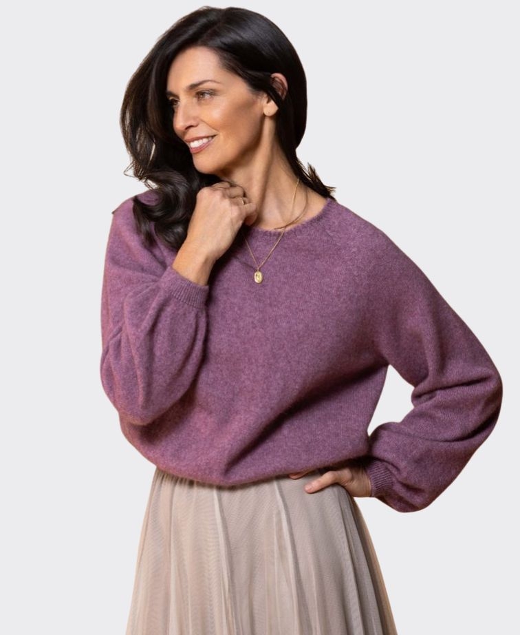 This fashion-edge style incorporates cropped body length and over-sized sleeves. Finished off with a fine tubular neck trim.