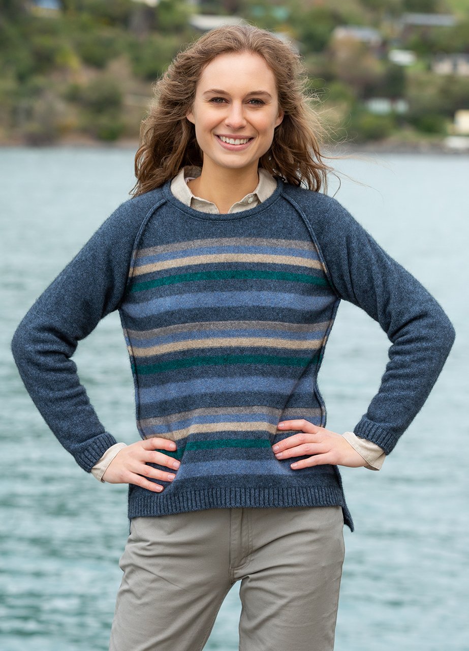 Style and warmth combined. This raglan sleeve possum merino crew neck jumper features exposed external seams and a drop down back. Featuring a carnival stripe at the front and plain at the back.40% Possum Fur, 53% Merino, 7% Silk