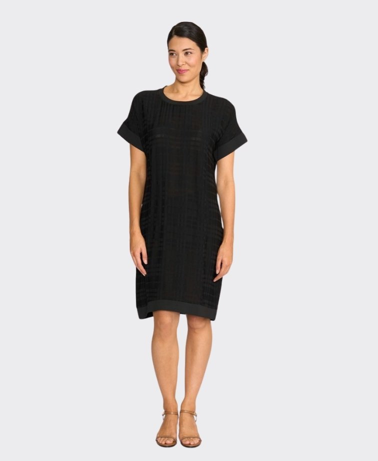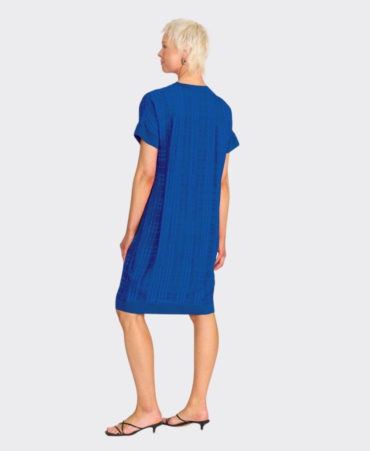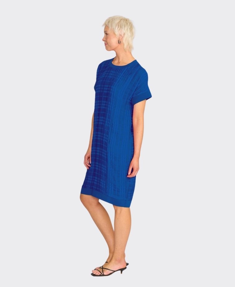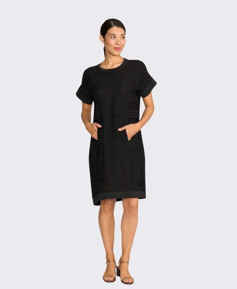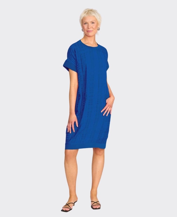 An easy to throw on relaxed fit dress. This style has a dyed to match rib trim on the neckband, cuffs and hem giving it a slight cocoon shape. Panel details through the body make it flattering and hidden pockets add functionality. Body length taken at the centre front approx. 100cm (size 12 )
