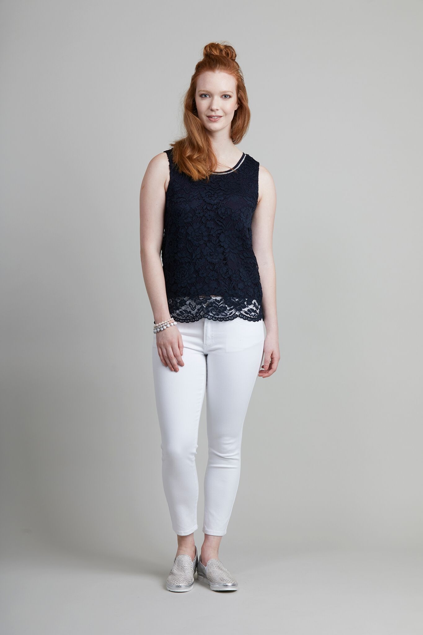 Elegant `midnight` colour stretch top with silver rib trim and lace overlay.