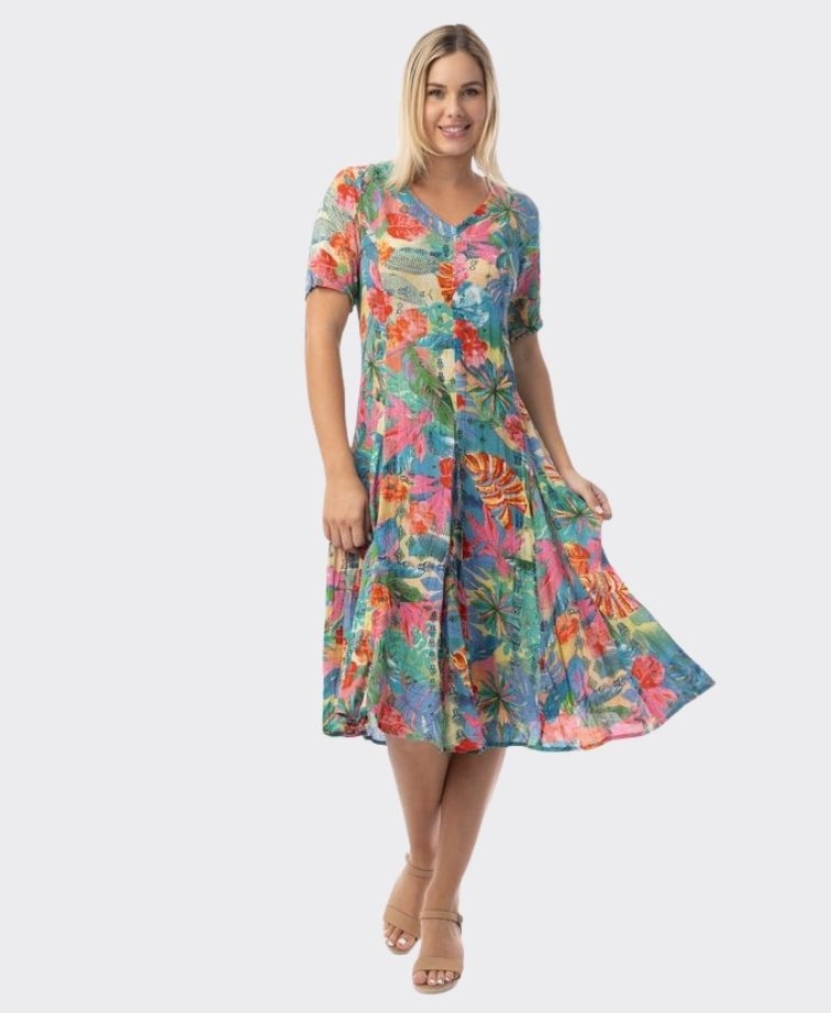 Enhance your summer wardrobe with this gorgeous Godet dress. Made from natural fibres, it features short sleeves, a flattering v-neckline, stunning colourful print, and godet panels through the skirt that create a beautiful drape and swing in the skirt. Ideal for enjoying warm summer days, this dress combines comfort and style effortlessly.
