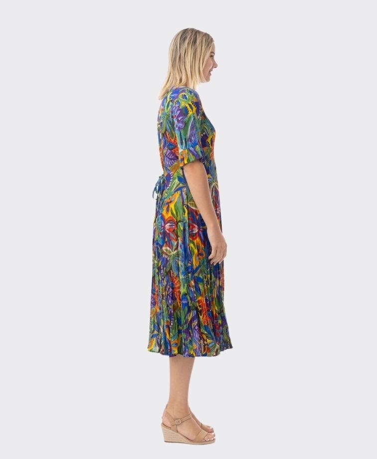 Flaunt your summer style with our stunning Godet dress. Made from natural fibres, it features short sleeves, a flattering v-neckline, stunning colourful print, and godet panels through the skirt that create a beautiful drape and swing in the skirt. Ideal for enjoying warm summer days, this dress combines comfort and style effortlessly.
