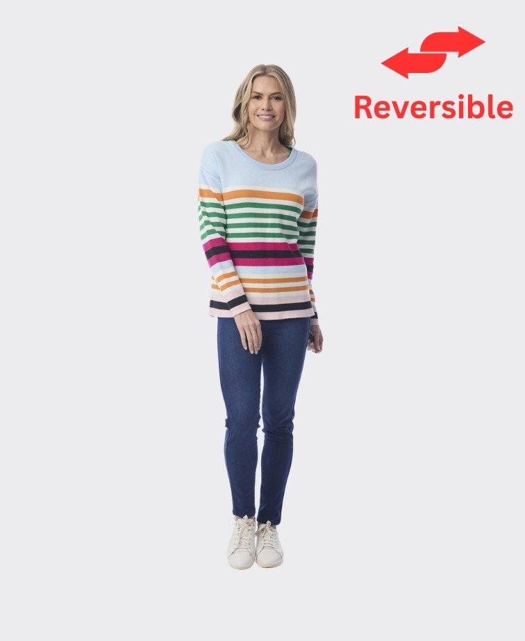 Enjoy two looks in one with the Orientique Reversible Stripe Crew Knit. Crafted from 100% organic cotton, this soft knit jumper feels comfortable against the skin while adding vibrant colour and playful style to your wardrobe.