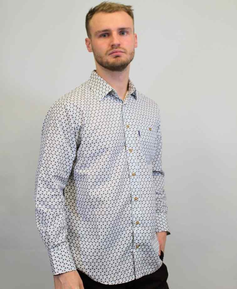 Mens Long sleeve print shirt, classic fit shirt with a front chest pocket. Derived from wood pulp, these polynosic shirts are also known as iron cheaters for their wrinkle resistant properties. Iron cheater shirts are the perfect travel companion as they require little or no ironing.