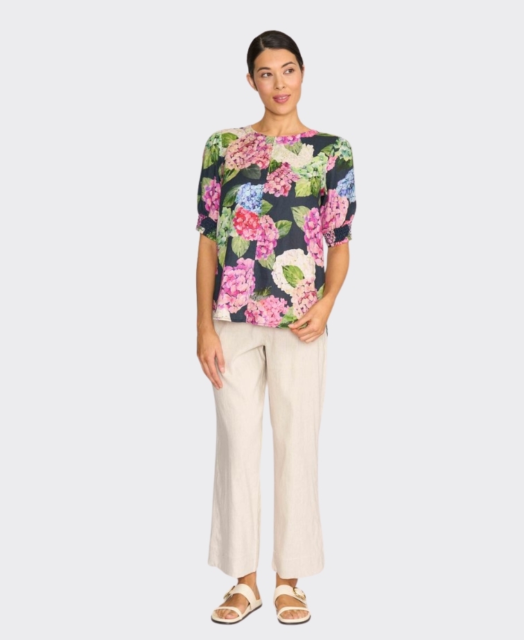 Relaxed short sleeve top with voluminous short sleeves and shirred cuffs. Round neck. Total body length from shoulder to hem is approx. 68.5cm (size 12)