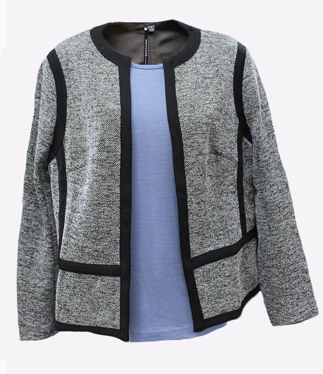 This cropped cotton rich , herringbone jacket offers style and comfort featuring black tape trim around the front openings, neck and lower panels highlighting the great shape.