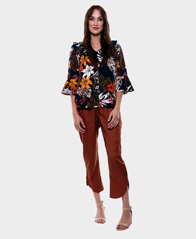 A super flattering, easy care top with that all essential vee neck and featuring a vee overlay frill. The sleeves are 3/4 length and again feature frill detail at the bottom. The body has a good generous shape to it assuring the wearer that there will be the necessary coverage on offer. In a large tropical, floral print there are some great colours to lead you through summer.