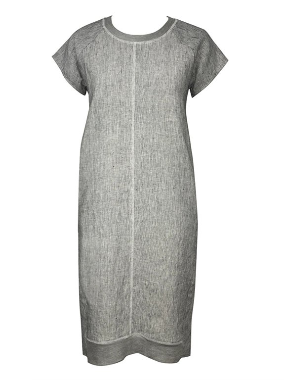A super funky 100% linen ress with soft rib trim detail at the neck and front hemline band. Sleeves are easy fit raglan. The side seams are cut towards the front with side pockets giving a flattering finish. Highlighted overlocking is featured at the centre front and neckband.
