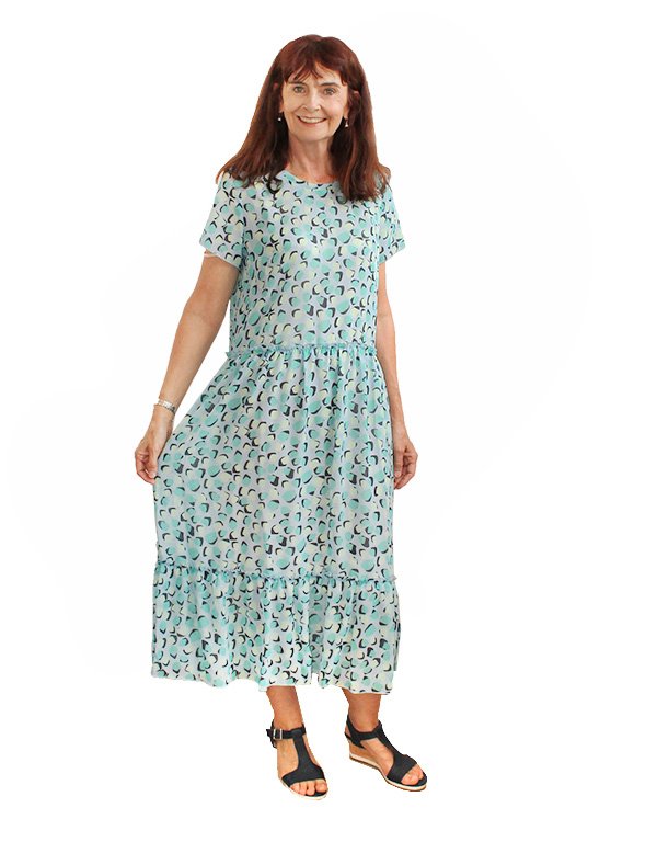 Printed Chiffon unlined short sleeve dress exposed seam detail at waist and hem frill