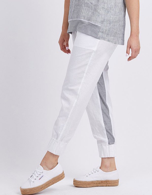 A sporty take on a linen pant. Comfortable and stylish describe these 100% linen pants featuring a soft grey rib trim waistband with drawstring and inside leg panels. The cuffs are finished with super wide square patch pockets that are included on the front and there are flap top pockets on the back.