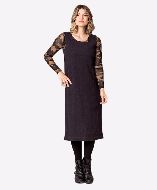 This black pinafore dress lined with front pockets is an essential and versatile item in your wardrobe for the cooler months. Team this up with the So-Mee Top Axel Layering for a look!