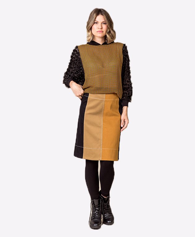 This Autumn coloured palette is a fun A-line skirt, featuring a contrast stitch and colour blocking. Wear in the winter time with stockings to keep warm or without during the warmer months for a fresh look. This is a versatile skirt for the wardrobe.