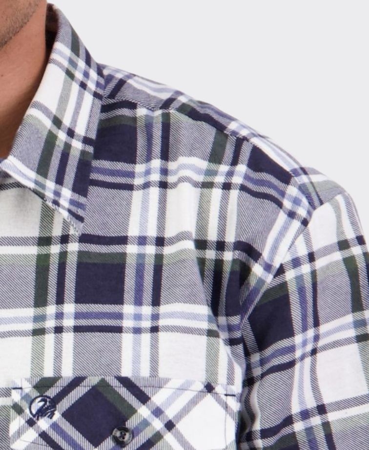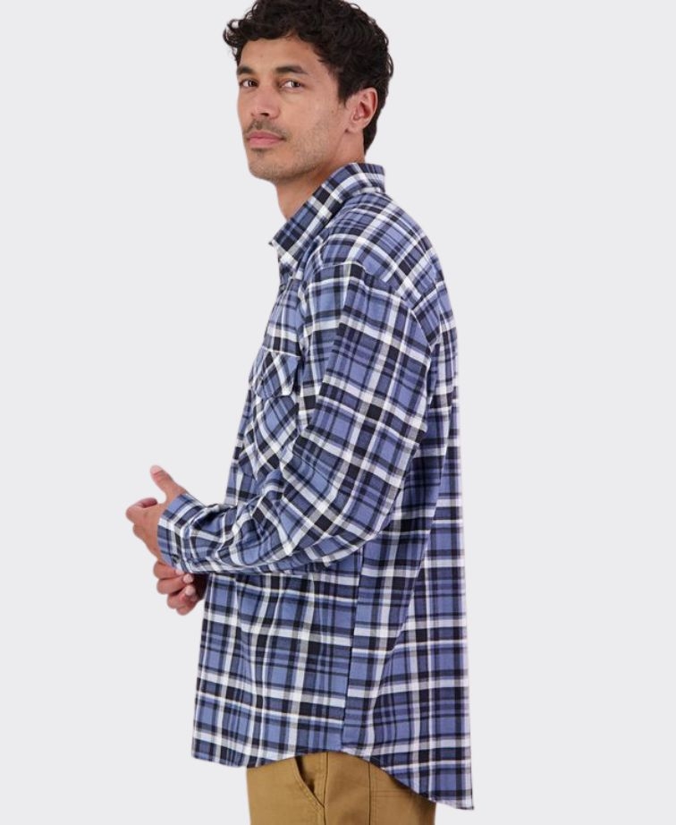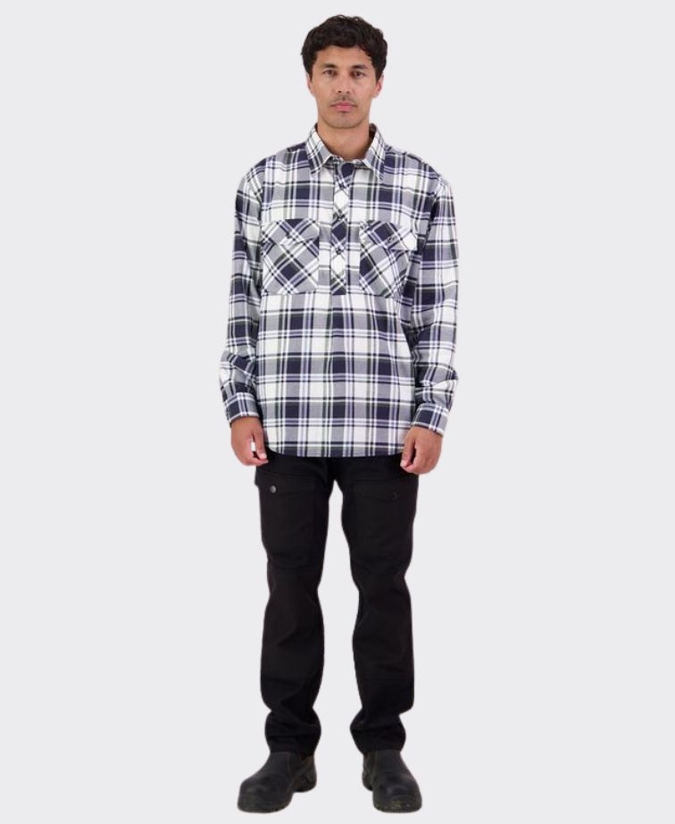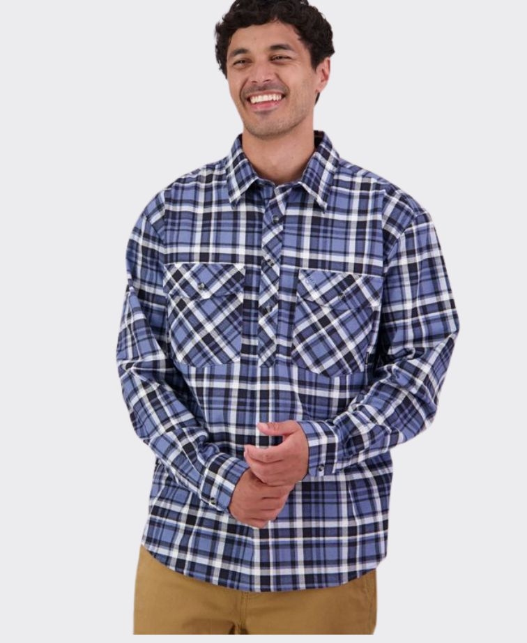100% Cotton, brushed for warmth and softness with workwear styling and a half button placket.