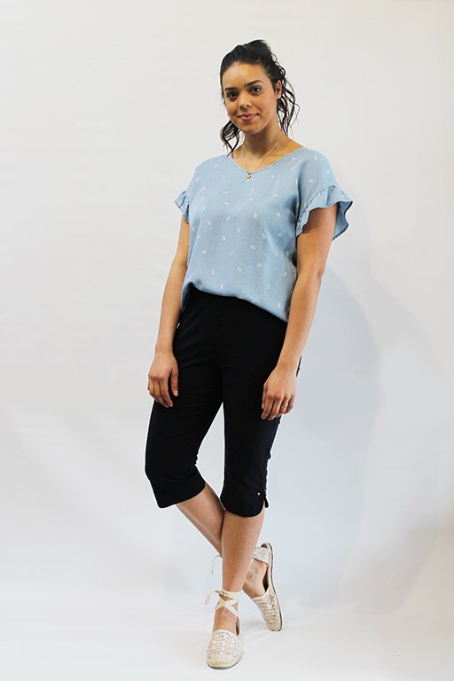 These pull on cropped pants are the ultimate comfort 3/4 pant in soft viscose/nylon fabric that move with you. They have faux pockets and a shaped split at the side with a stud finish.