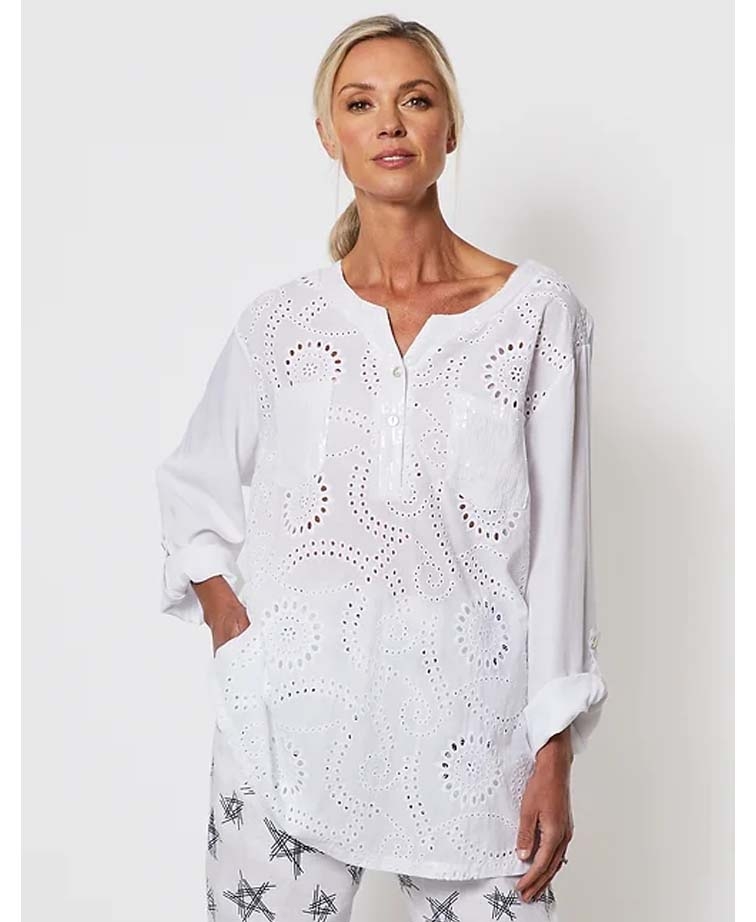 - Sleeves and back crafted in a matching fluid cotton fabric