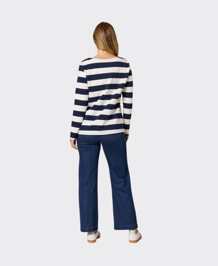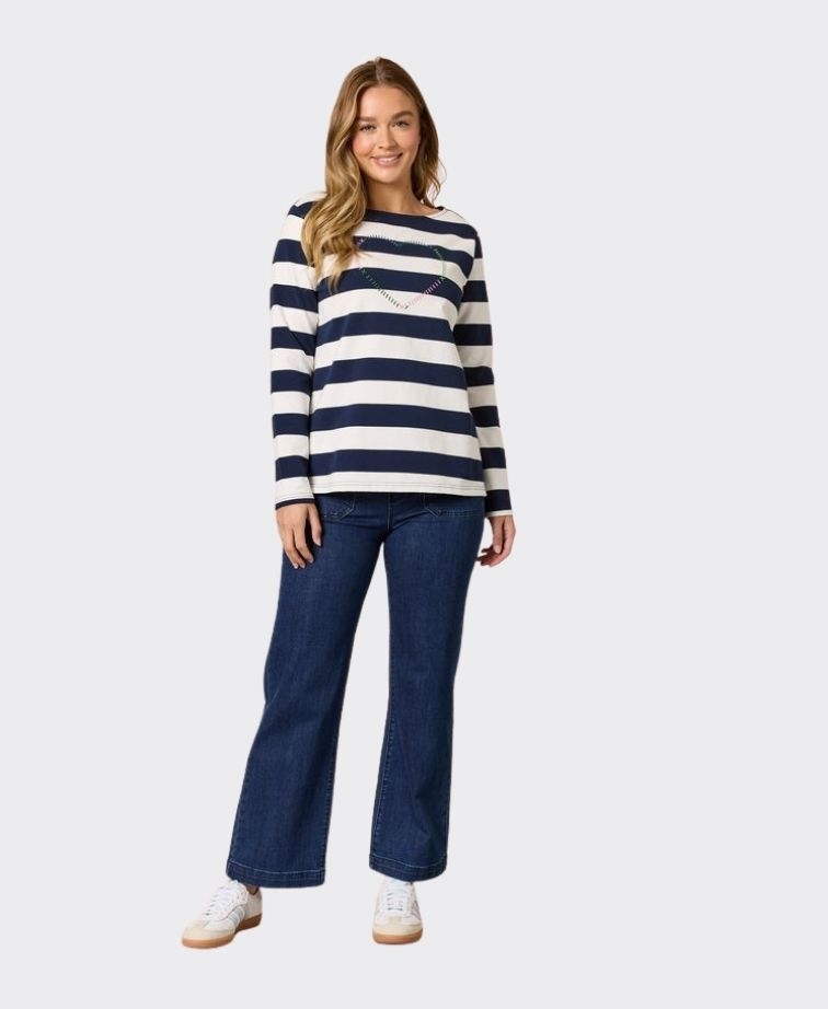 Add a playful touch to your everyday wardrobe with the Threadz From The Heart Stripe Tee. Featuring timeless navy and white stripes, this long-sleeve top is elevated with a colourful embroidered heart motif, bringing personality and charm to a classic silhouette.