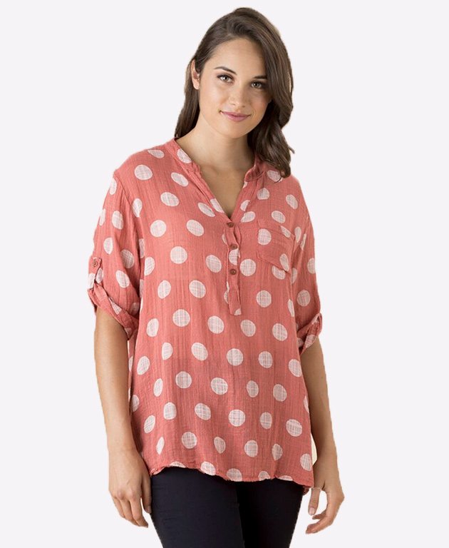 This soft cotton muslin coral and cream polka dot shirt has a mandarin collar, adjustable roll-up sleeves with a tab fastening and a top stitched chest pocket. In the Threadz easy fit and the perfect piece to wear with your facourite pair of jeans.