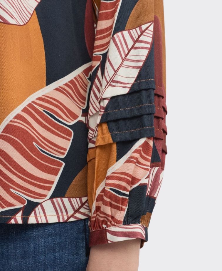 Featuring a bold nature-inspired print in warm tones of rust, ochre, and deep navy, it brings a modern, artistic feel to everyday dressing. The soft V-neckline with a delicate tie detail enhances the silhouette, while long sleeves can be worn loose or casually rolled for versatile styling.