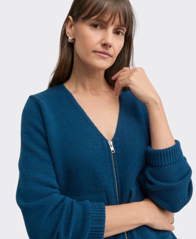 Framed by a flattering V-neckline with a zip-through front, this cardigan combines practicality with a clean, refined look. Long sleeves with ribbed cuffs provide a snug finish, while large front flap pockets add both function and everyday appeal. Perfect for layering over fine knits or cotton shirting, it transitions effortlessly from casual outings to relaxed evenings.