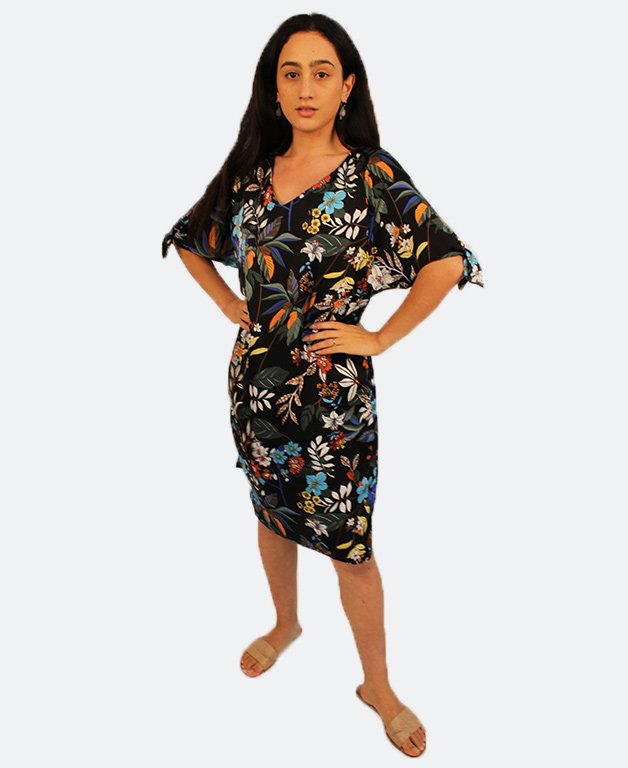 A stunning, vibrant print dress featuring a flattering vee neck and tie detail short sleeves. In a comfortable stretch polyester fabric, hibiscus print dress will take you to all sorts of occasions through summer.