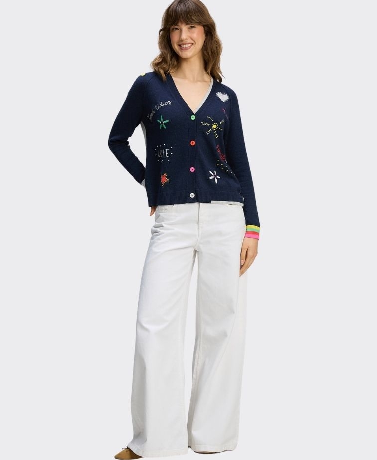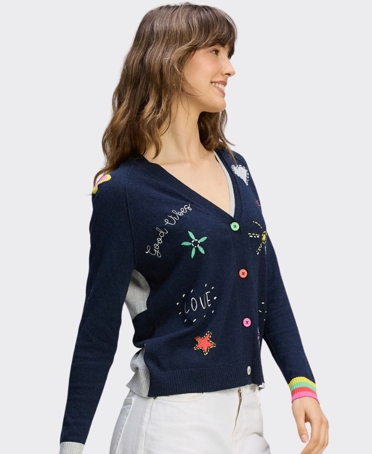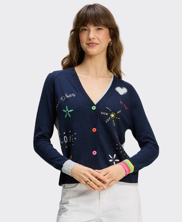 Carry positivity with you in the Zaket & Plover Good Vibes Cardi, a playful and uplifting update to the much-loved Happy Cardi. Designed with hand-stitched details and embroidery, this cardigan features daily reminders of confidence and joy — “Love,” “Good Vibes,” “Sprinkle Happy,” and “Be You!” — woven into every stitch.